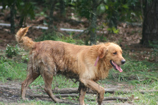 Whenever my pool boy(Eric) back washes the pump, it pumps water into the yard. D.J. loves when he does it. D.J. will go lay down right where the water pumps. I caputred the moment yesterday. Must be nice to be a dog.